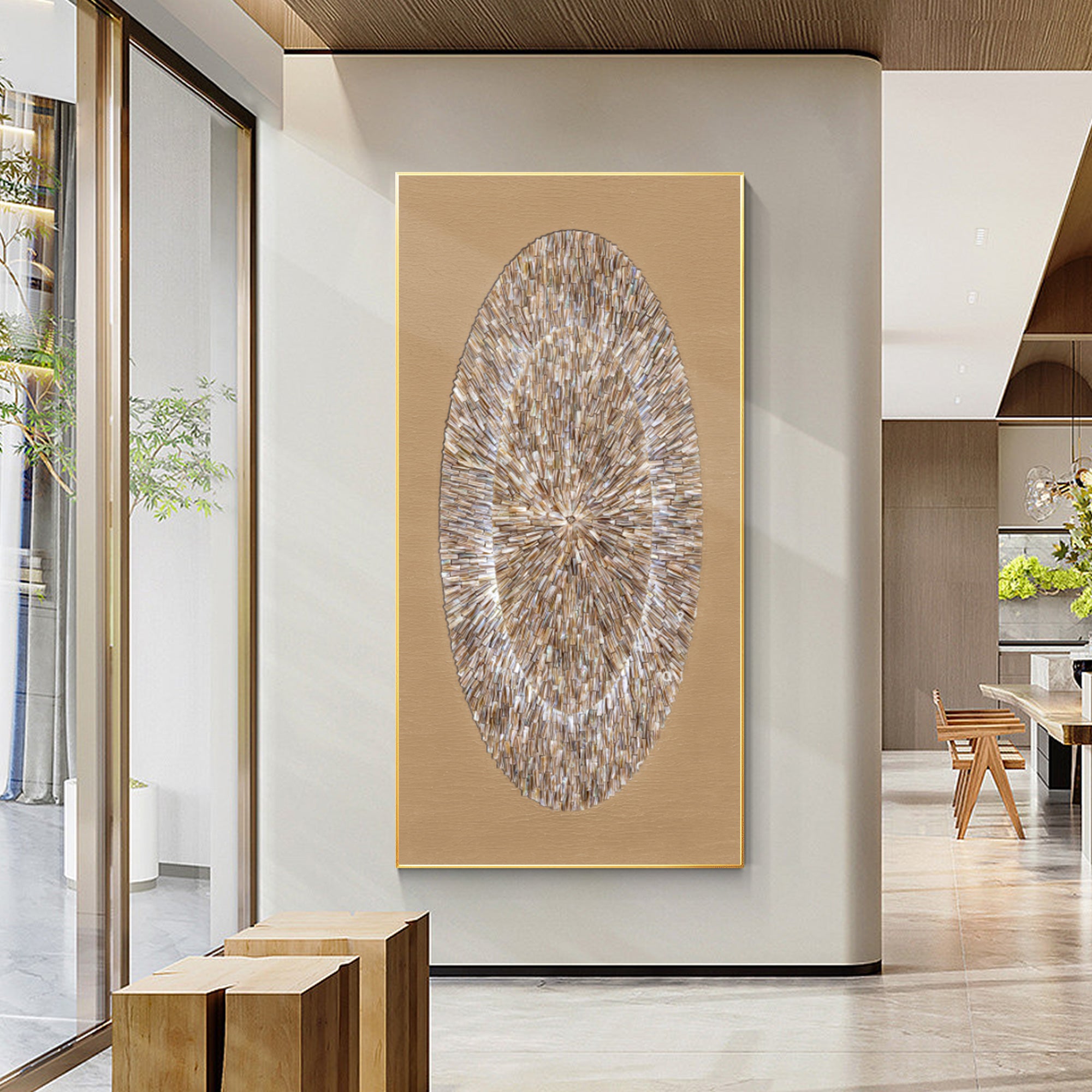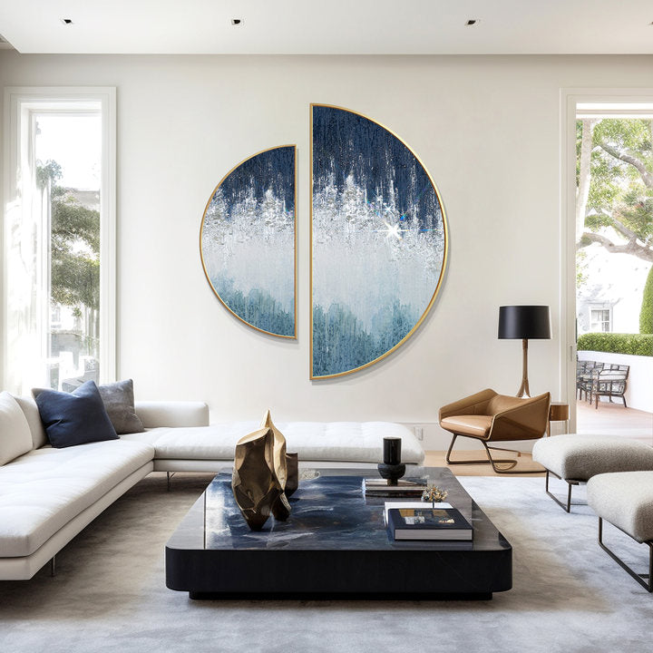 Our artworks are hand-painted using oil or acrylic on high-quality canvas. Many pieces also feature special materials like crushed glass, natural sea shells,gold leaf, silver foil, natural wood, or textured resin to create depth and dimension.