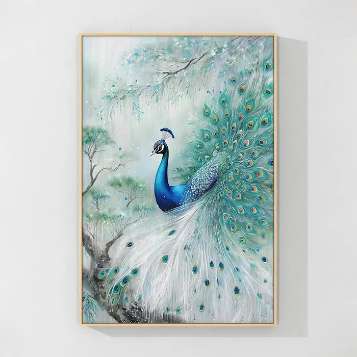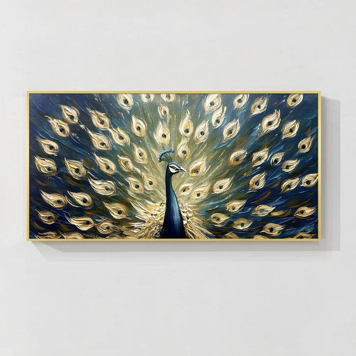 Vibrant peacock oil painting with brilliant blue and green feathers, designed to add luxury and elegance to your walls